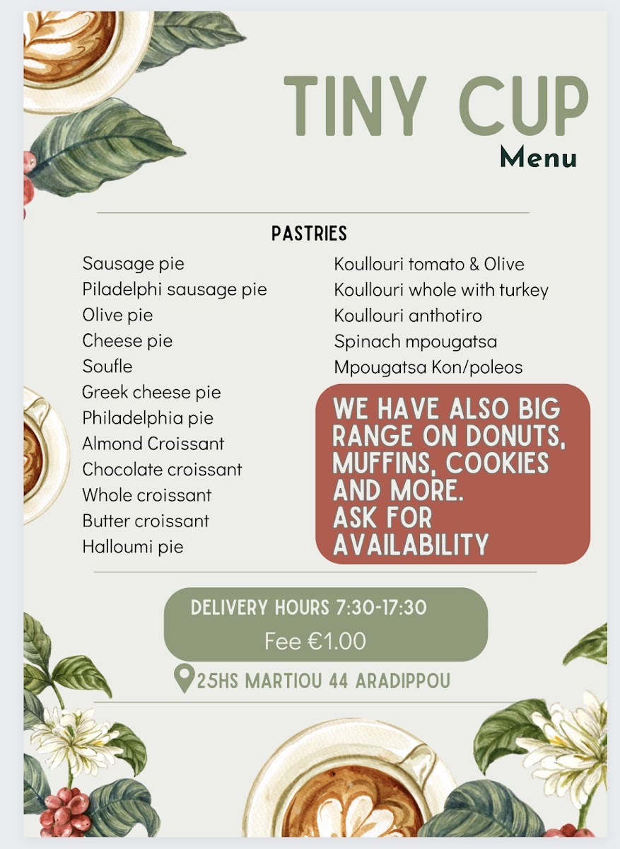 Whether you’re a local in need of your caffeine fix or just passing through, Tiny Cup Coffee Shop is a must-visit destination in Aradippou. Offering delicious coffee, friendly service, and a warm inviting atmosphere, it’s a place where you can take a moment to relax while enjoying life’s simple pleasures. So why wait? Visit Tiny Cup Coffee Shop today – your taste buds will thank you!